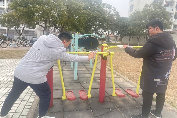 图为同学们擦拭锻炼器材。记者 李婧颖