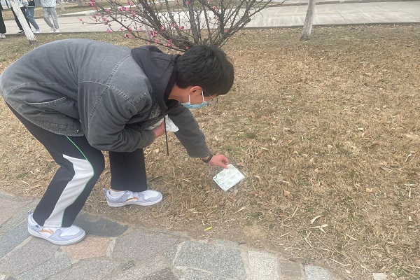 图为同学清理草坪垃圾。记者 李婧颖