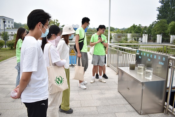 接着,讲解员带领志愿者参观了污水处理厂。从学习污水处理流程图到参观进水提升泵房、水解均质池、初沉池、生化池等污水处理装置,讲解员根据工艺流程,用通俗易懂的语言和生动的例子讲述“污水变清”的过程。在参观过程中,讲解员现场进行了一次水样抽测对比,亲自取出的出水与矿泉水对比,并无很大的差别,使得同学们对污水处理有了更加直观的了解