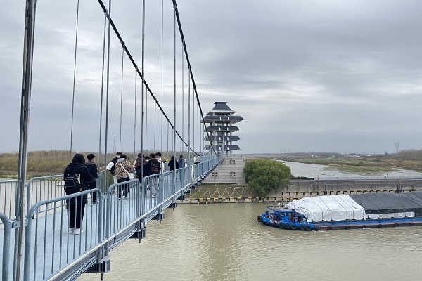 接着,同学们抵达淮安水上立交,进一步了解淮河水、京杭大运河。讲解员的讲解让同学们知道了淮河水的发源地、途径地与入海口等知识。她讲解道:“展览馆里陈列了一代又一代的治水伟人,他们用智慧为后世留下诸多治水经验。水上立交将现代工程与淮安古运河文化融为一体,桥头堡建筑钢索缆桥,犹如彩练当空,采用现代科学技术主要起到防洪泄洪的作用。”