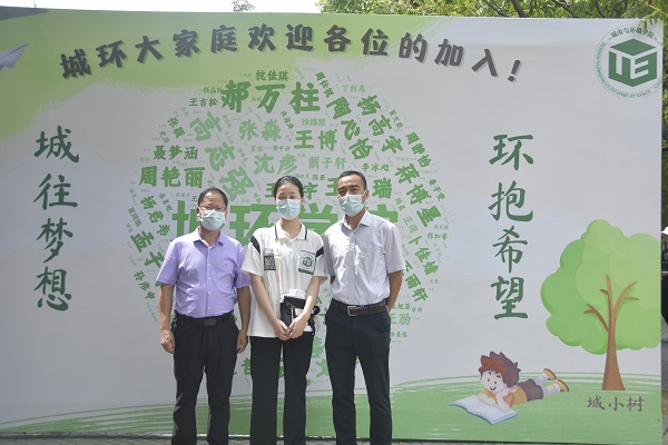 图为新生与副董事长、城环公司经理毛广雄、班主任申大魁合影。记者 谢欣楠 摄
