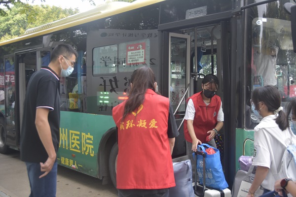 图为新生乘车前往宿舍。记者 谢欣楠 摄