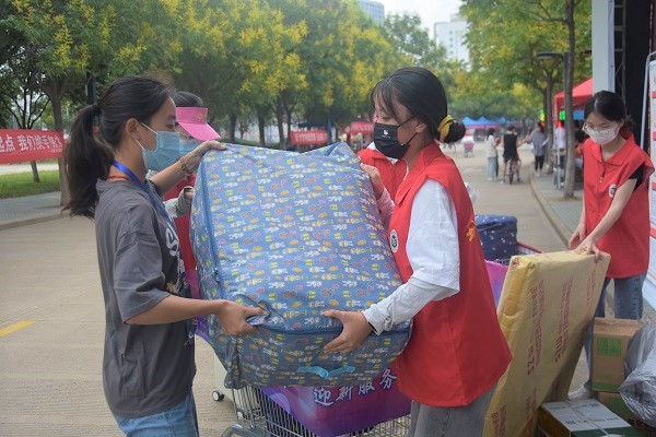 图为志愿者帮助新生搬运行李。记者 谢欣楠 摄