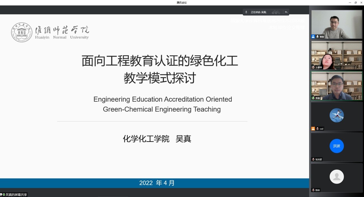 吴真老师作了题为《面向工程教育认证的绿色化工教学模式探讨》的交流,以绿色化工教学模式为切入点,结合化院在课程教学改革方面取得的成果,分析了工程教育认证对专业教学和人才培养提出的要求,提出了顺应认证需求的教学模式。