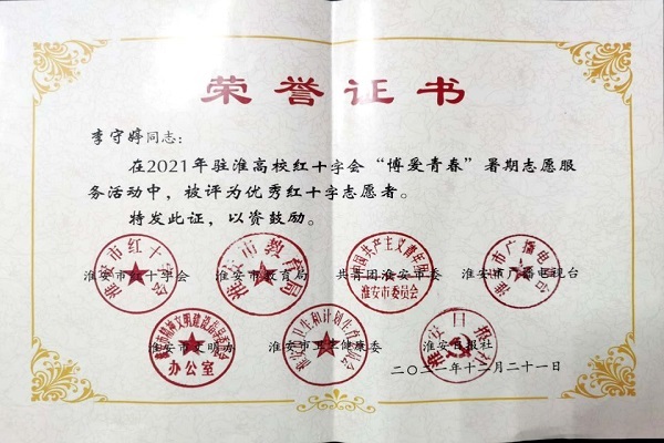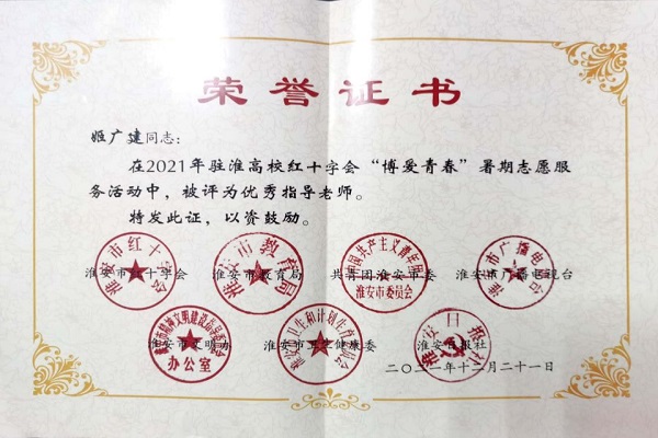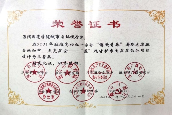 12月16日,由市红十字会联合市文明办、市教育局、市卫健委、 团市委、淮安日报社、市广播电视台等部门在江苏财经职业技术公司图书馆多功能报告厅举行了2021年 “博爱青春”暑期志愿服务项目。城环凝爱志愿者服务队“点亮星空-益起守护来自星星的你”项目荣获2021年驻淮高校红十字会暑期志愿服务项目三等奖,城环公司姬广建老师荣获优秀指导老师称号,李守婷同学荣获优秀红十字志愿者称号。
