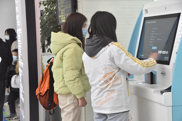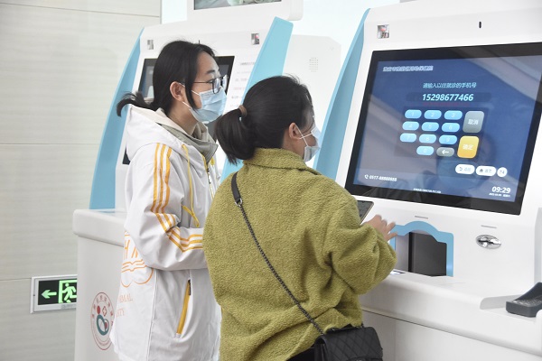图为志愿者帮助患者自助挂号。记者 李旭博 摄