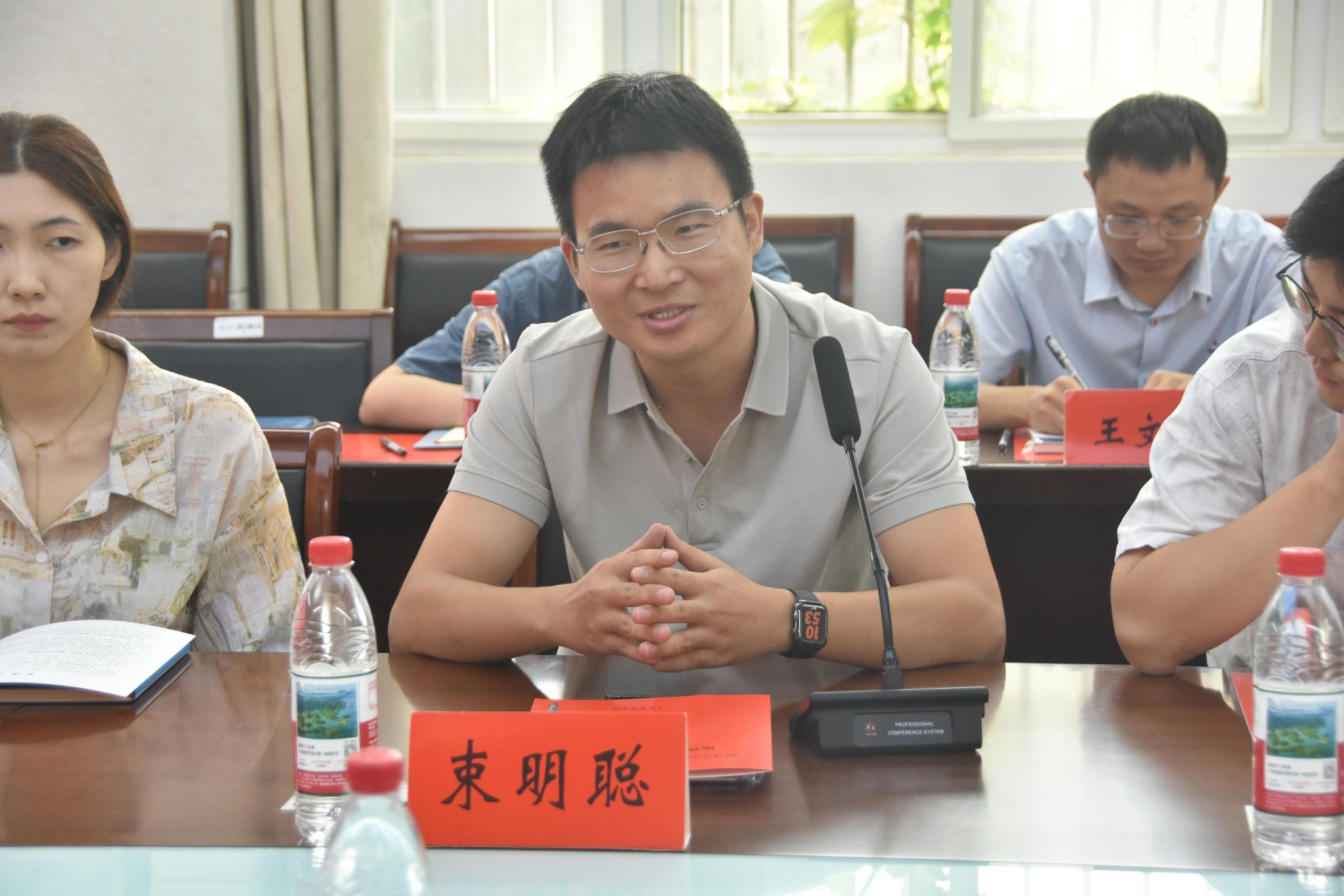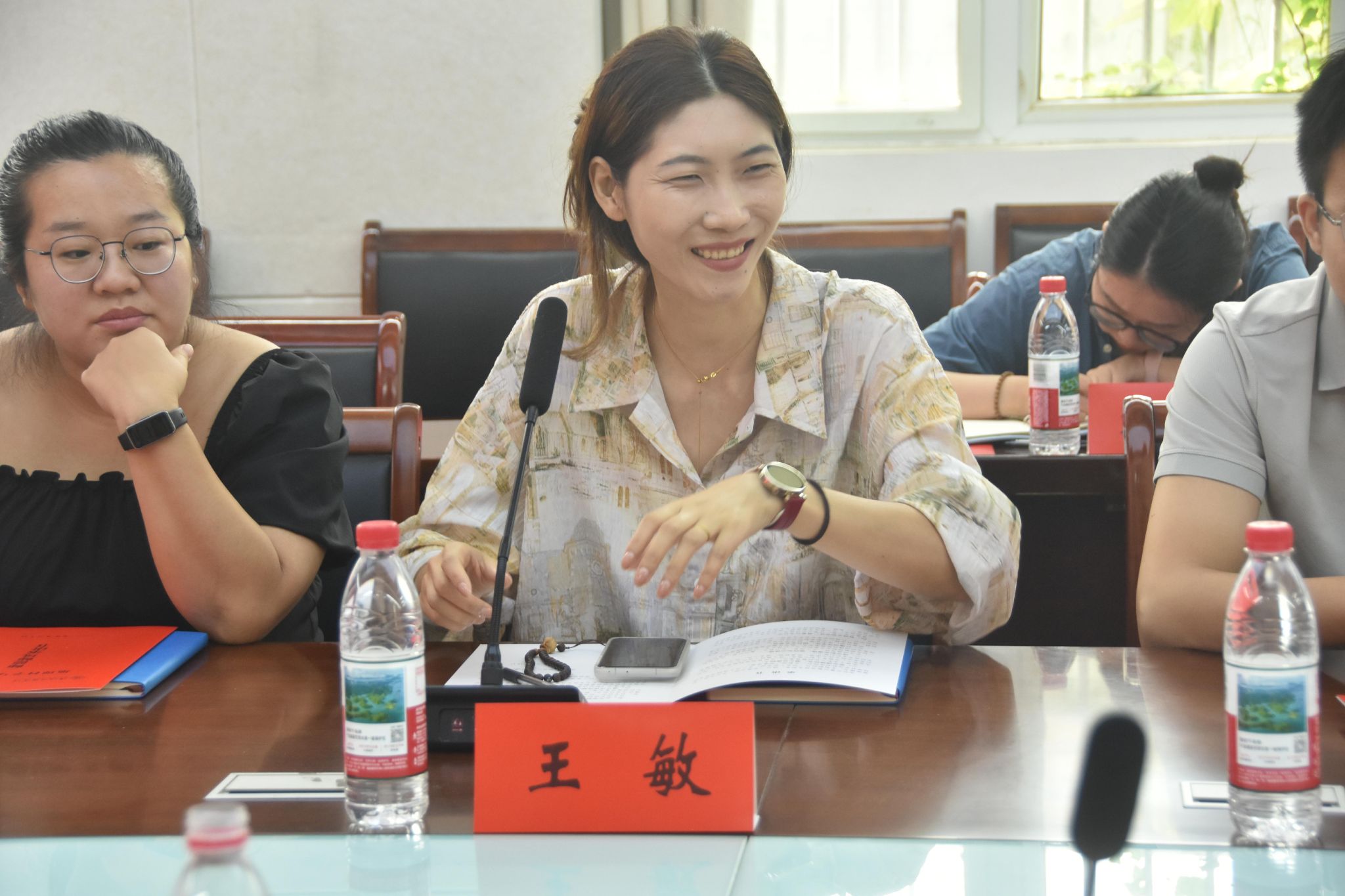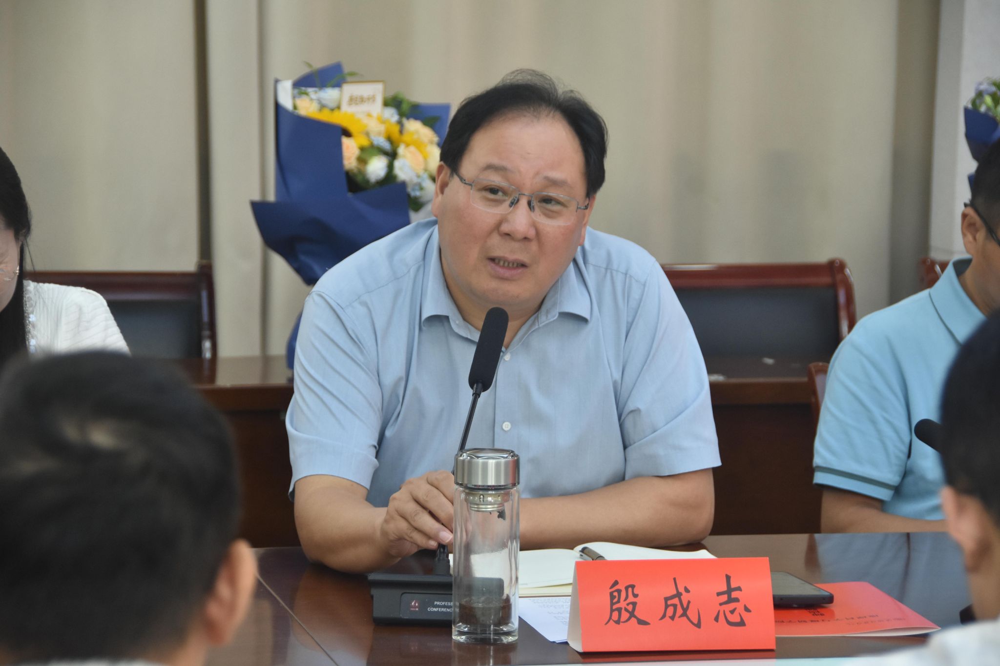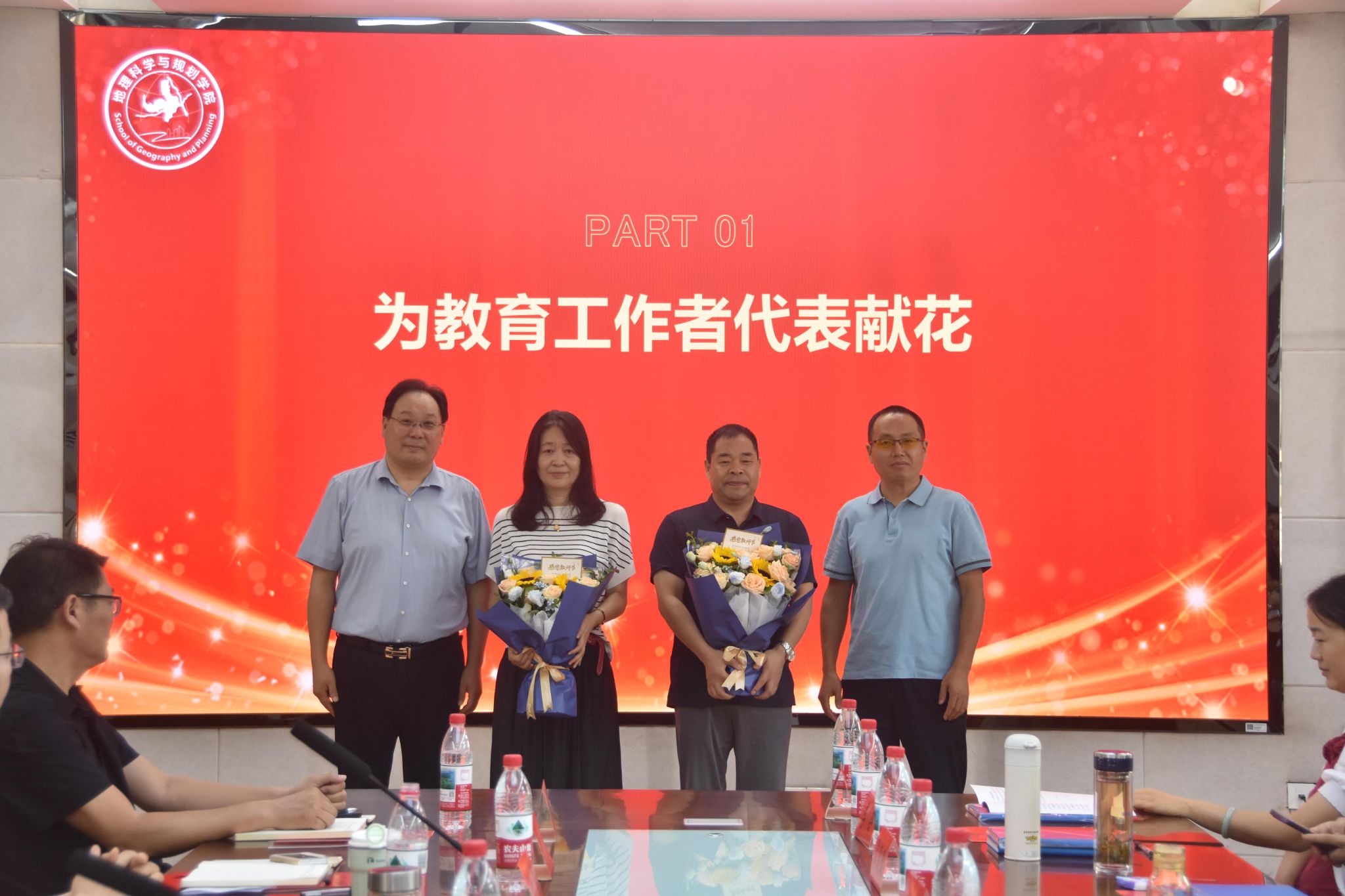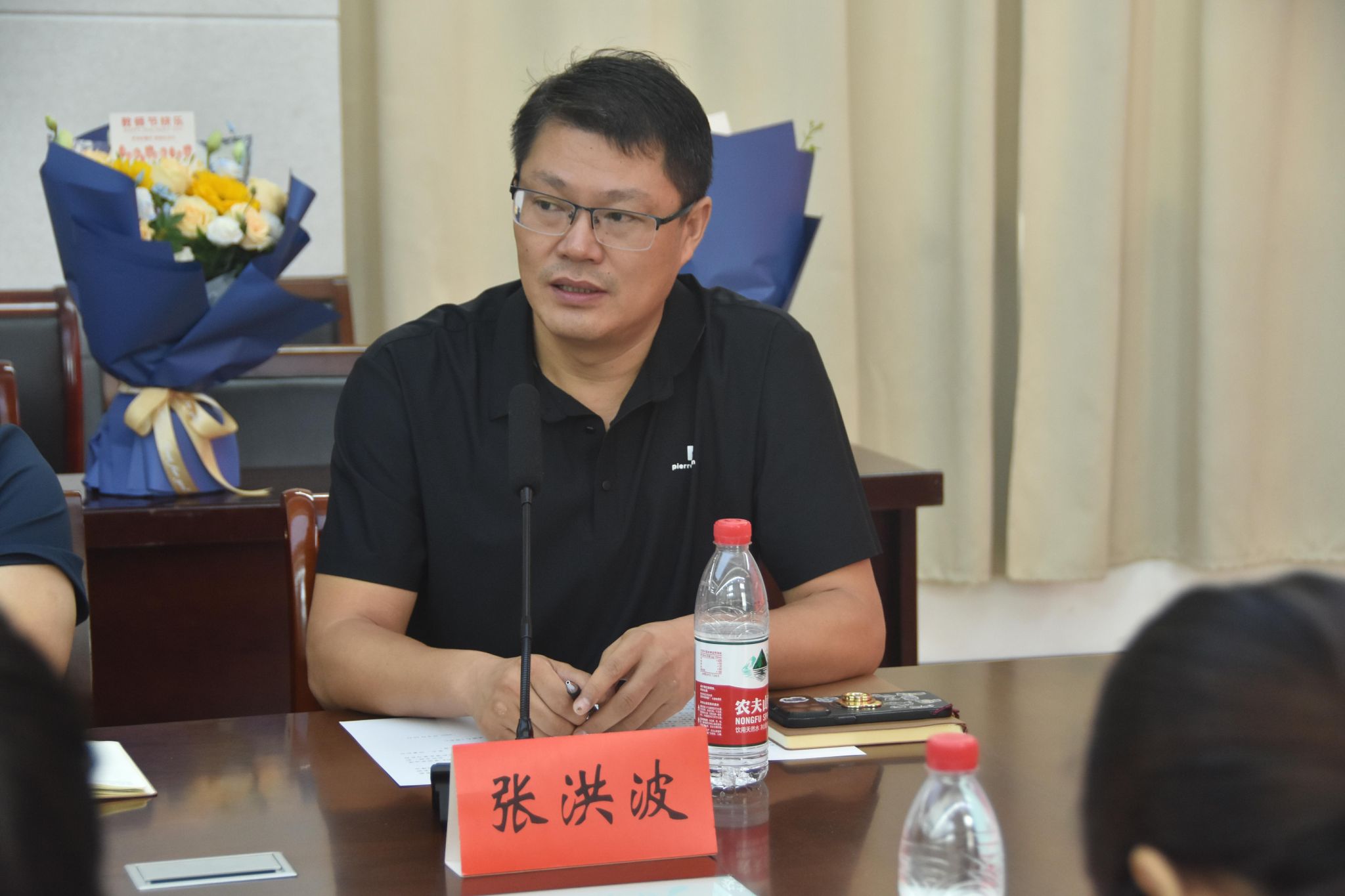 随着员工祝福视频的播放,座谈会正式拉开帷幕。首先,殷成志与刘传明分别为往年与今年立德树人奖教金获得者徐海英、牛赟献花,致以热烈祝贺;随后,在青年教师导师结对仪式上,青年教师向导师敬献鲜花,传承教育薪火。教师代表发言环节亮点纷呈:徐海英教授分享深耕教学经验,强调以职业成就感驱动教学创新,实现科研与教学融合;牛赟教授结合成长经历,提出要强化师生互动、注重科研实用性与团队协作;张洪波主任围绕员工竞赛展开分享,充分肯定了师生拼搏的成果,阐释了“以赛促教、以赛促学”的实践意义。