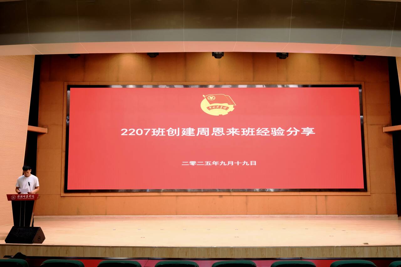 紧接着,2207班员工代表刘嘉豪上台分享班级“创周”经验,他强调了周恩来总理的崇高品德和伟大精神,并激励同学们积极进取、团结互助。