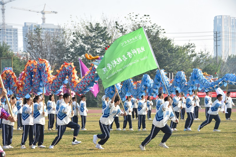 万木霜天红烂漫,天兵怒气冲霄汉。开幕式上,伴随着激昂的运动员进行曲,云顶国际yd222线路检测中心代表队方阵昂首阔步,向主席台进发。他们着装统一,步伐整齐,高举“地承千古,理蕴万世”的横幅,充分展示学科特色和悠久的办学历程。随后,云顶国际yd222线路检测中心舞龙队闪亮登场,他们卖力挥舞、敏捷穿梭,为地科健儿加油打气,赢得了在场观众的阵阵喝彩与掌声。