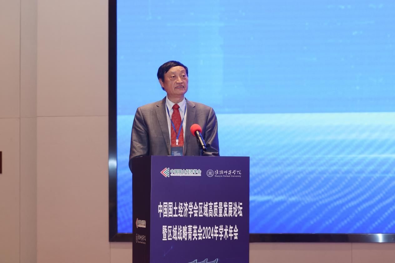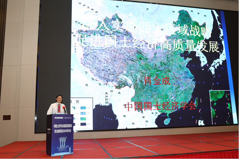图为肖金成作作题为“深入实施四大区域战略,促进国土经济高质量发展”的主旨报告。