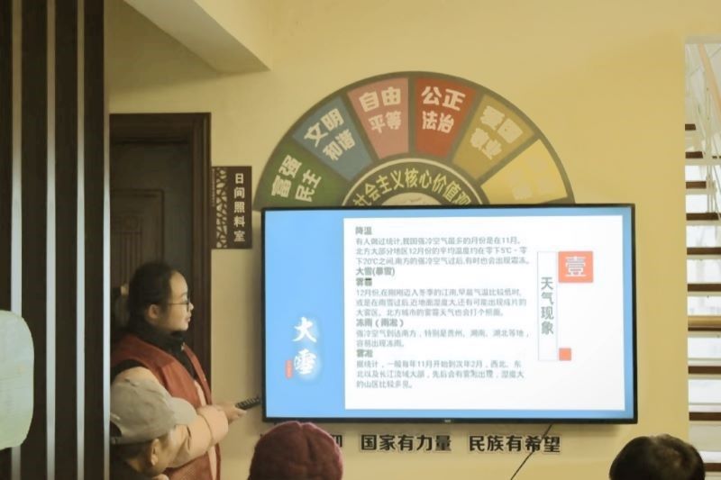 活动最后,志愿者为老人们科普大雪民俗知识。他们运用形象生动的语言及图文展示,为老人们讲述了大雪节气的由来、历史渊源、民间传说以及特色民俗。此外,关于“腌肉”“观赏封河”等民俗活动的分享,也引起了老人们的浓厚兴趣,他们纷纷回忆起自己年轻时的冬日经历,与大家共同进行愉快的交流互动。
