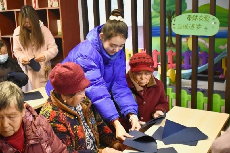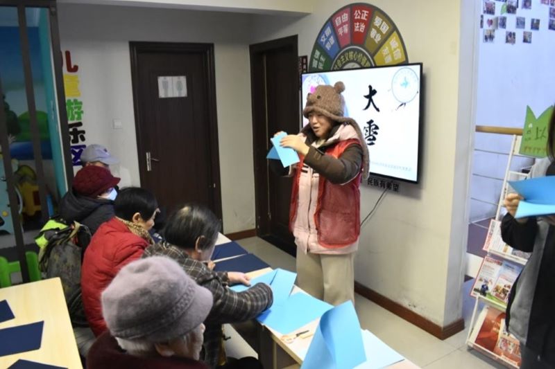 活动首先进行的是手工雪花剪纸环节。志愿者悉心讲解剪纸技巧与步骤,老人们饶有兴致地拿起剪刀彩纸,小心翼翼地折叠裁剪。随着剪刀的咔嚓声,一张张精美的雪花剪纸逐渐成形,大家用这些剪纸装饰现场,营造出浓厚的“大雪”氛围,寄寓着对美好冬日的祝福。