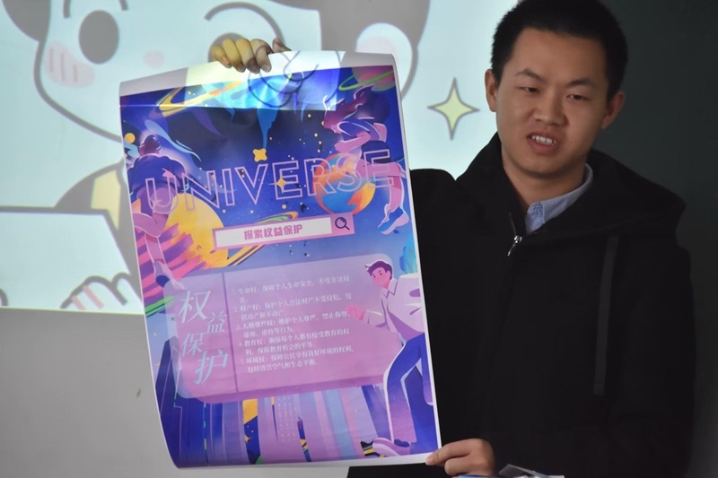 随后,同学们依次展示了他们精心制作的以权益为主题的星空海报。借助PPT和视频等多媒体工具,一幅幅令人目不暇接的精美海报展现在大家眼前。海报都巧妙地结合了权益保护的元素和星空的神秘之美,无论是在构图的巧妙、色彩的和谐搭配,还是文字的精准表达上,都充分展现了同学们对星空的热爱以及对权益议题的深刻理解和关注。