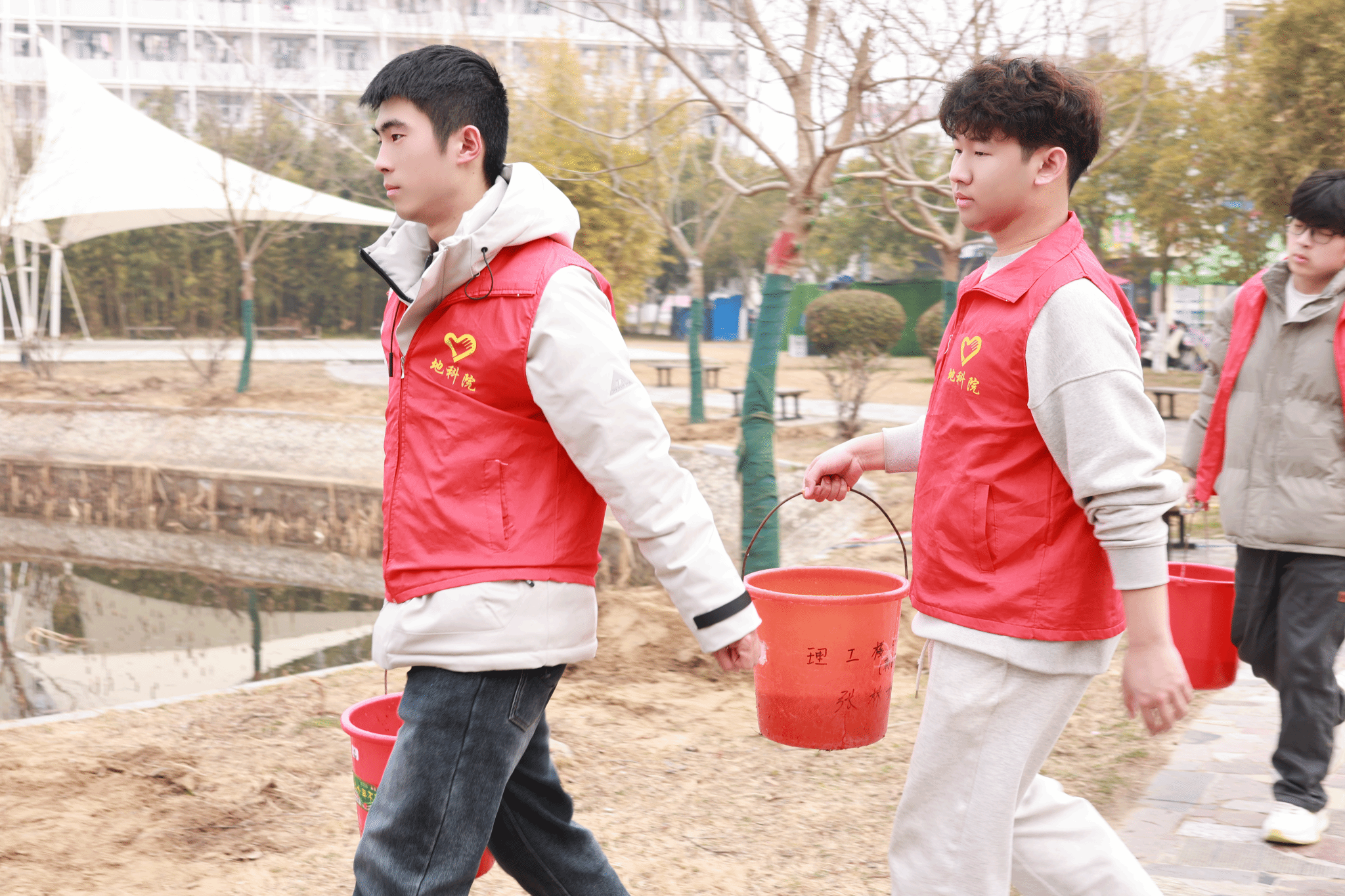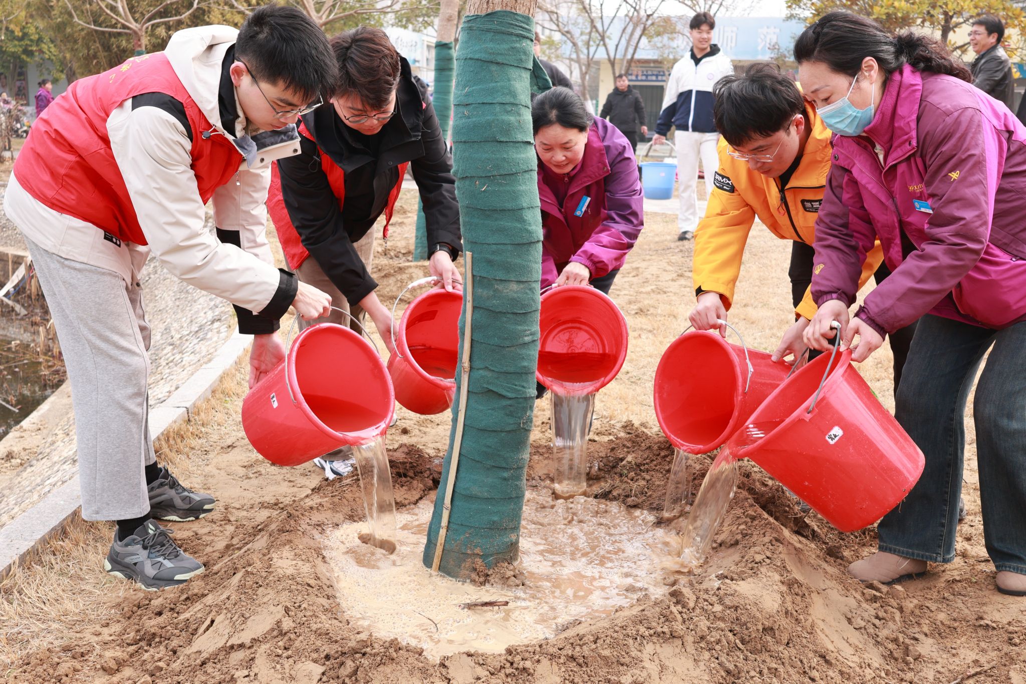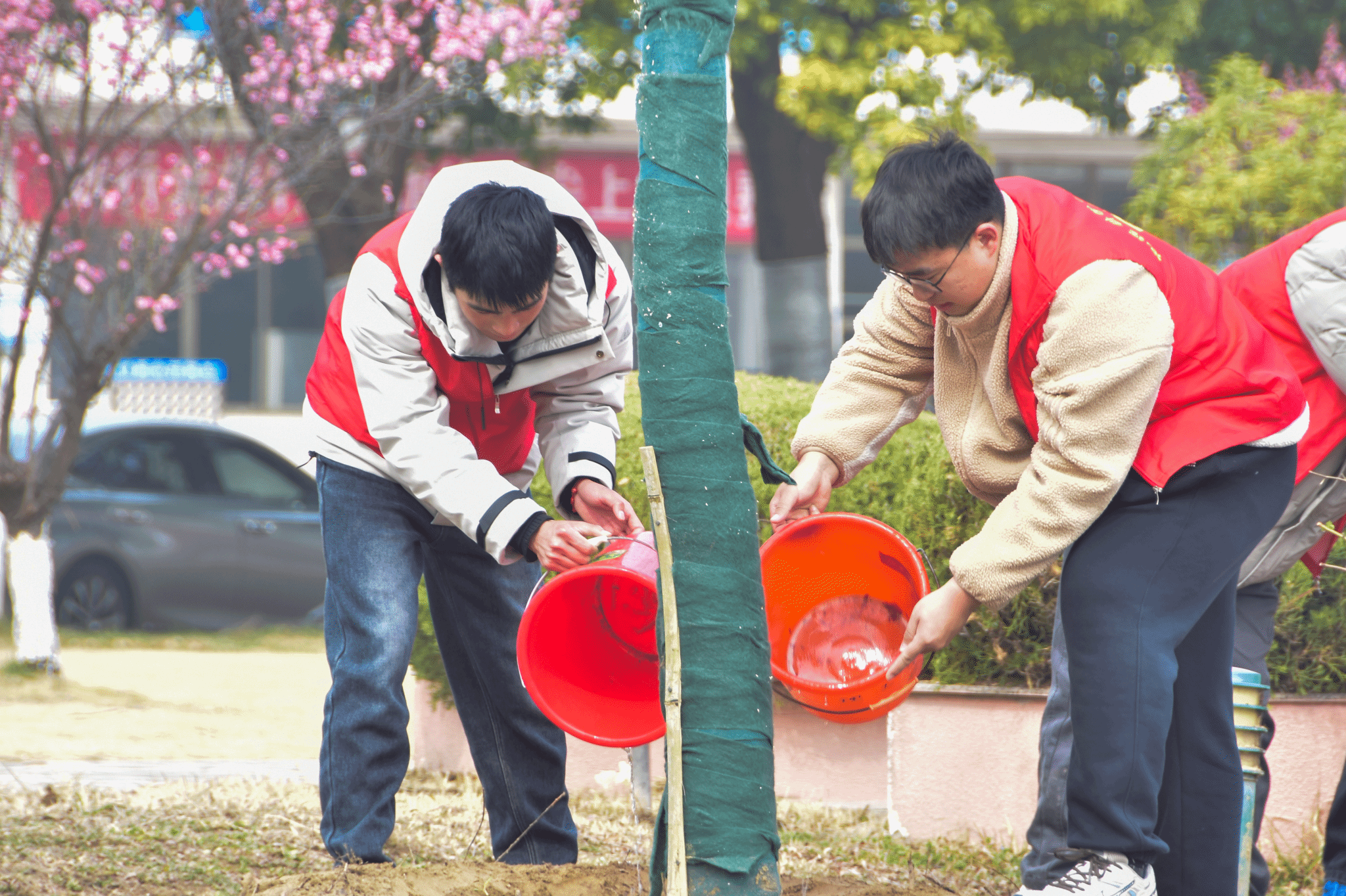 地科公司党委书记殷成志向同学们简要介绍了植树节的历史由来,强调了植树造林对改善生态环境、提升生活质量的重要意义,并细致入微地讲解了植树要领和注意事项。随后,在后勤服务集团老师们的指导下,志愿者们迅速两两结伴,分工明确,挥锹铲土、扶正树苗、细心填土夯实,浇灌树苗,每一个动作都流畅而默契,现场洋溢着团结协作的喜悦氛围。师生挽起袖子、齐心协力,一派热火朝天、生机盎然的劳动景象。经过一上午的辛勤劳动,一棵棵小树苗在土地上扎根,树苗迎风而立,展现出勃勃生机。这些树苗不仅是绿色的象征,更是同学们为校园增添的一抹希望,为生态环境贡献的一份力量。