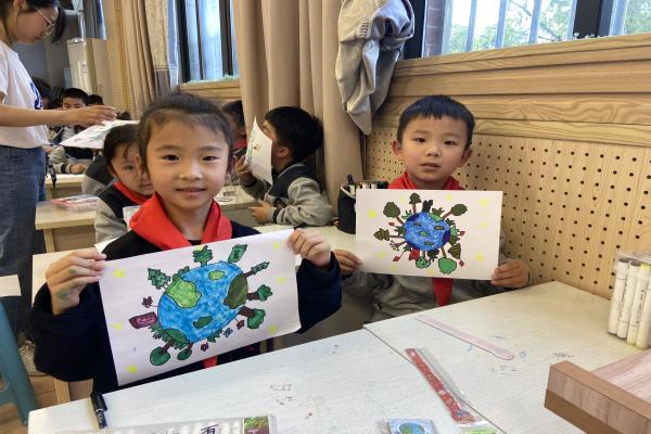 图为小朋友展示“我心中的地球”作品。记者 李可欣
