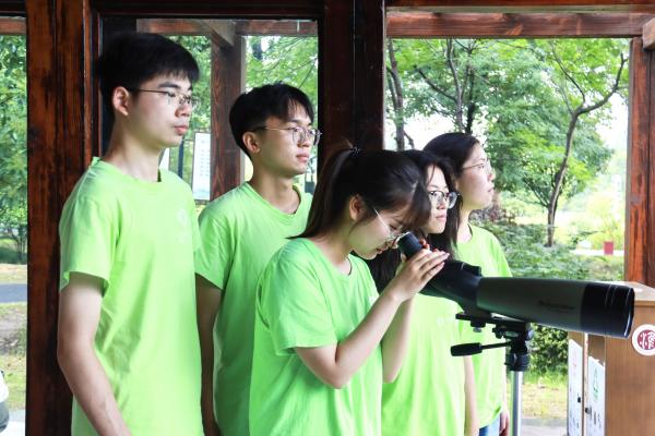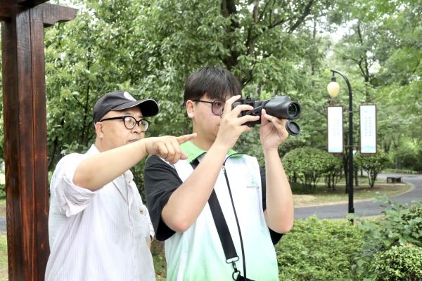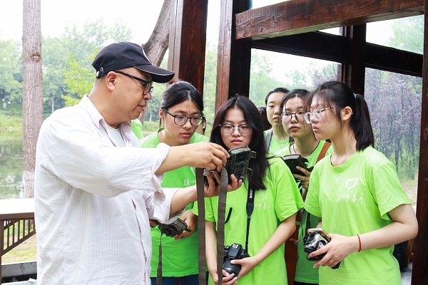 紧接着,志愿者们来到古淮河湿地公园。颜海浪老师将志愿者们分组,为每组配备相机、红外探测仪,详细介绍了设备的具体使用方法,并带领志愿者们在园内对各种水鸟进行观察、抓拍。此外,颜海浪老师还指导志愿者们在灵犀桥、莲子亭、同船渡等地点附近布置红外探测仪辅助观测。在实践过程中,志愿者们认真学习,积极主动向颜海浪老师请教问题,逐步认识到保护水环境对水鸟生存繁衍的重要性。