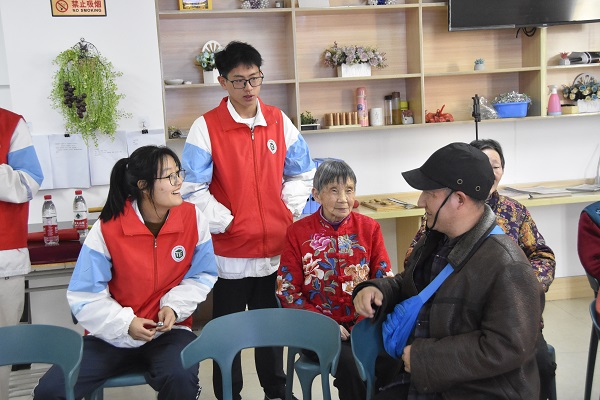 图为志愿者们和老人聊天。记者 朱诣高 摄