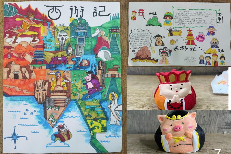 活动前期,同学们组队查阅旅游攻略,通过手绘西游主题旅游路线海报,深入了解西游文化,掌握地理知识,增强学习兴趣。各小组提交的参赛作品色彩明艳,画工精湛,栩栩如生,刻画出了唐僧师徒四人的鲜明形象,囊括了《西游记》中家喻户晓的许多场景。