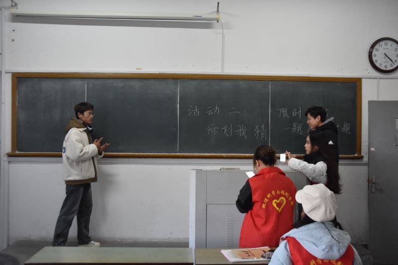 在“你画我猜”环节中,同学们两两组队,充分发挥自己的想象力,并通过四肢语言、线索暗示等方法引导搭档猜词。同学们在猜词的过程中不断磨合,彼此间的默契不断提高,活动现场气氛活跃。