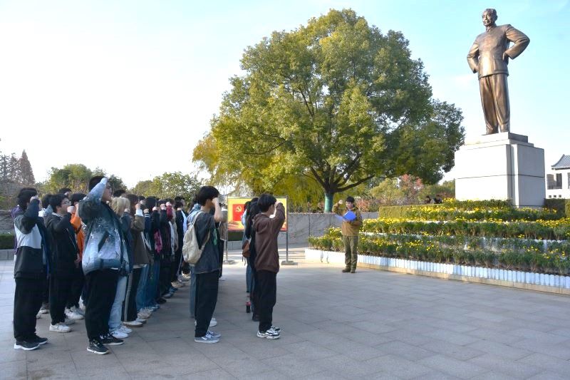 紧接着,同学们来到铜像广场,与周恩来铜像合影留念。合影结束后,40位入团积极分子在周恩来铜像下庄严宣誓。同学们“勤奋学习,积极工作,吃苦在前,享受在后”的誓言铿锵有力、掷地有声,彰显了同学们赓续伟人精神、传承红色血脉的坚定决心。