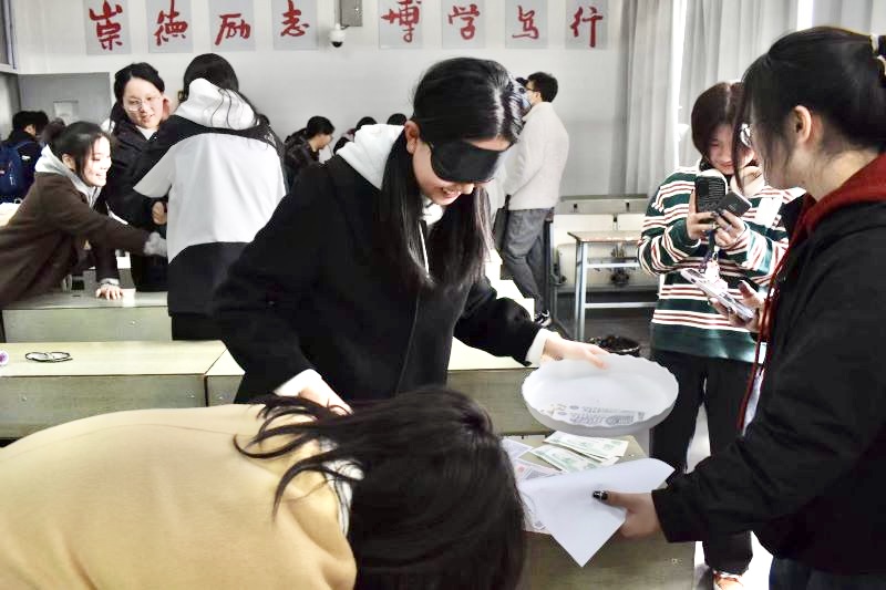紧接着,参与活动的同学们依次上台讲解亲自创作的消费者权益主题海报。辅以演示文稿、撕撕乐等富有创意的形式,同学们向评委们分享了创作海报的想法和理念。各组选手别具一格的绘图,纷纷引起现场的热烈掌声;绘声绘色的讲解,成功让消费权相关的知识变得生动易懂起来。在“守护钱袋子”活动中,各位“蒙眼”选手以铲子为“消费权”,铲起一张张“钱”,以有趣的方式模拟着维护消费者权益的过程。通过实践,同学们在遇到消费问题时不再害怕维权,而是积极维权、理性维权。