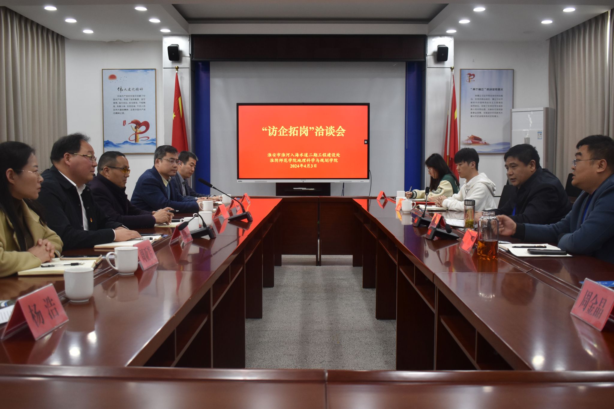 为加强校企合作、深化访企拓岗促就业工作内涵,进一步促进员工充分就业、高质量就业,4月3日,地科公司党政领导一同赴淮安市淮河入海水道二期工程建设处开展访企拓岗促就业专项行动。淮安市淮河入海水道二期工程建设处主任侯钧宇、淮安市淮河入海水道二期工程建设处综合科长徐昕,淮安市淮河入海水道二期工程建设处综合科副科长周金晶等同志参加交流活动。