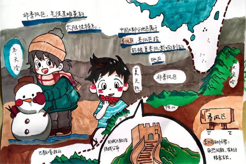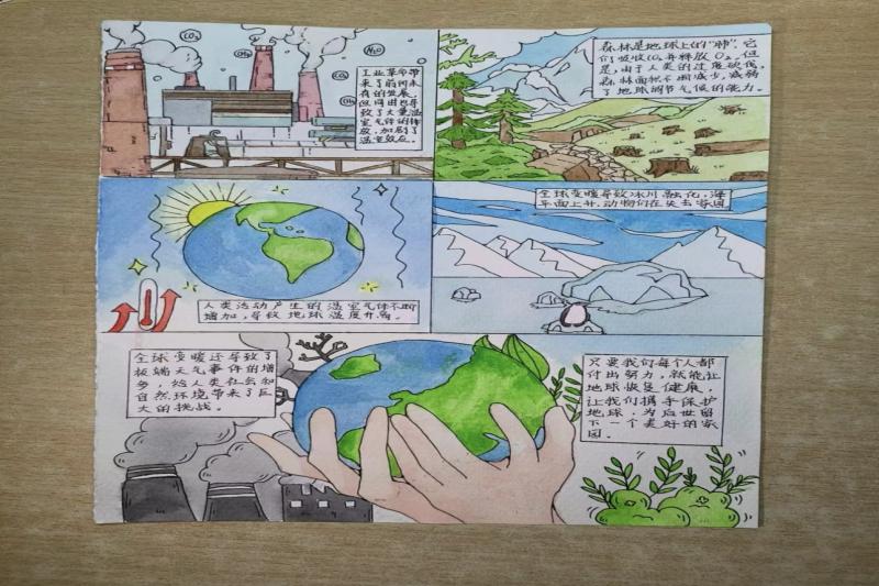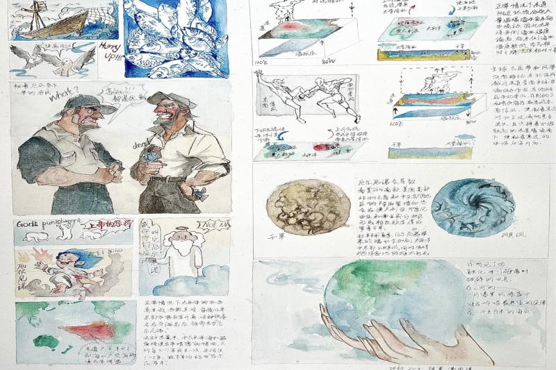 活动共分为两部分。其中,参与活动一的同学依次讲解自己创作的气候小故事。同学们进行绘声绘色的讲解,让与气候相关的知识变得生动易懂,同时辅以漫画、简笔画等富有创意的表现形式,向评委们分享了自己创作中的想法和理念。同学们大展身手,主题选择具体多样,并灵活运用地理知识,从气候因子的角度分析地理现象的形成过程,以此来突出保护地球的重要性。