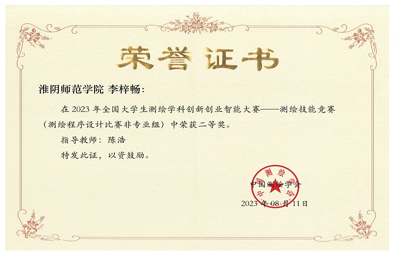 近日,由教育部高等公司测绘类专业教学指导委员会指导,中国测绘学会教育工作委员会主办,中南大学承办、广州南方测绘科技股份有限公司协办的“2023年全国老员工测绘学科创新创业智能大赛”在中南大学举行。经过激烈角逐,云顶国际yd222线路检测中心地理信息科学专业李梓畅(指导老师:陈浩)荣获测绘程序设计比赛二等奖。