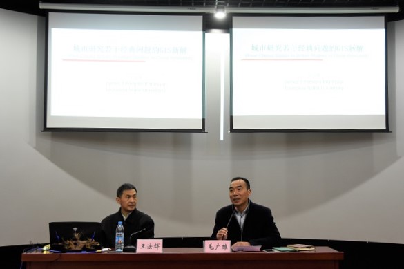 讲座正式开始,王法辉教授将问题分为“城市研究的两分法”、“城乡范围的界定和多分化”、“城镇化的阶段性和中国特色”、“城镇体系的网络界定法”、“城市内部人口密度方程的再探索”五个方面为在场师生做了详细的分析报告,然后从这五个部分分别举例讲解如何运用GIS技术研究城市问题。在讲到“城市范围的界定”时,王法辉教授将中国与美国的城市范围界定做比较,告诉同学们界定城乡的标准化要靠GIS落实到小地域单元,还要明确界定的目的,而且,在他看来,城市范围的界定应该由“定义行政化”转变为“去行政化”。