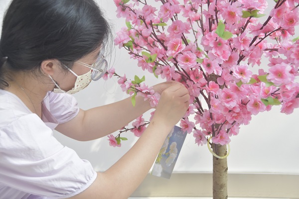 图为同学在心愿树上挂卡片。记者 赵艺雪 摄