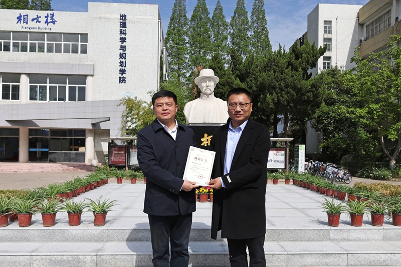 毛广雄与管爱花共同为张相文先生雕像揭像。对外合作处处长王钢为陆云峰颁发捐赠证书。