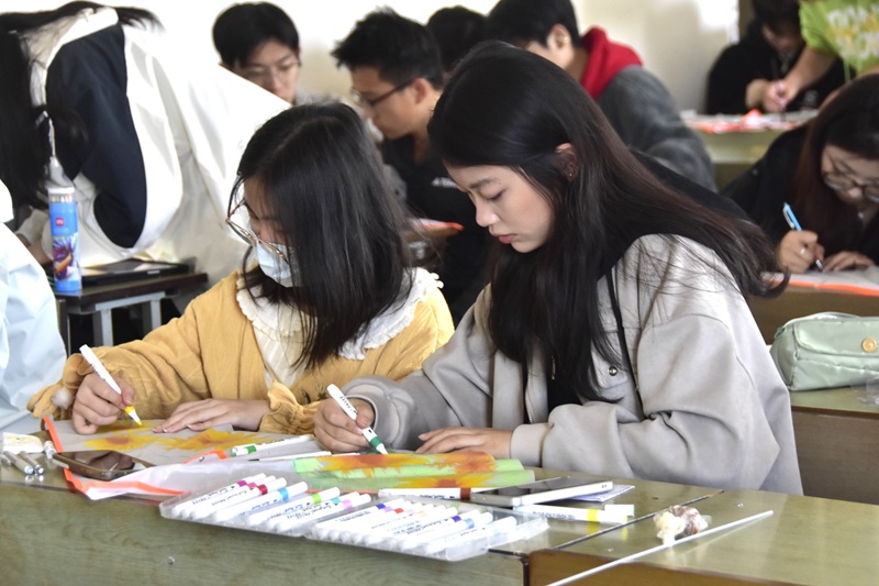 在DIY风筝环节,同学们围绕“惊蛰萌动”、“春分燕归”、“清明烟雨”等主题展开风筝绘画创作。在40分钟限时创作中,各团队彼此交流心得、分享技巧,大家充分发挥自己的想象力和创造力,将传统元素与现代设计相结合,有的设计出了形态各异的动物风筝,有的则制作出了色彩斑斓的鲜花图风筝,充分展现出美好的春日元素。