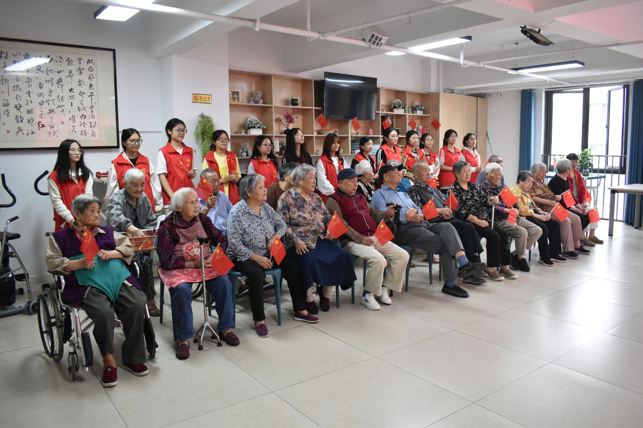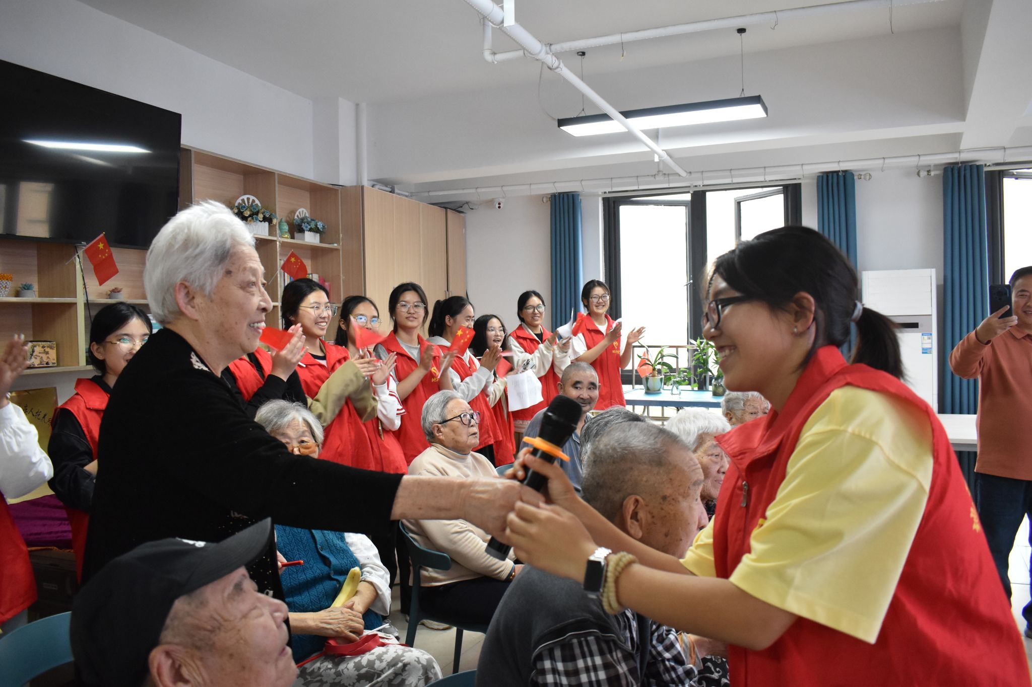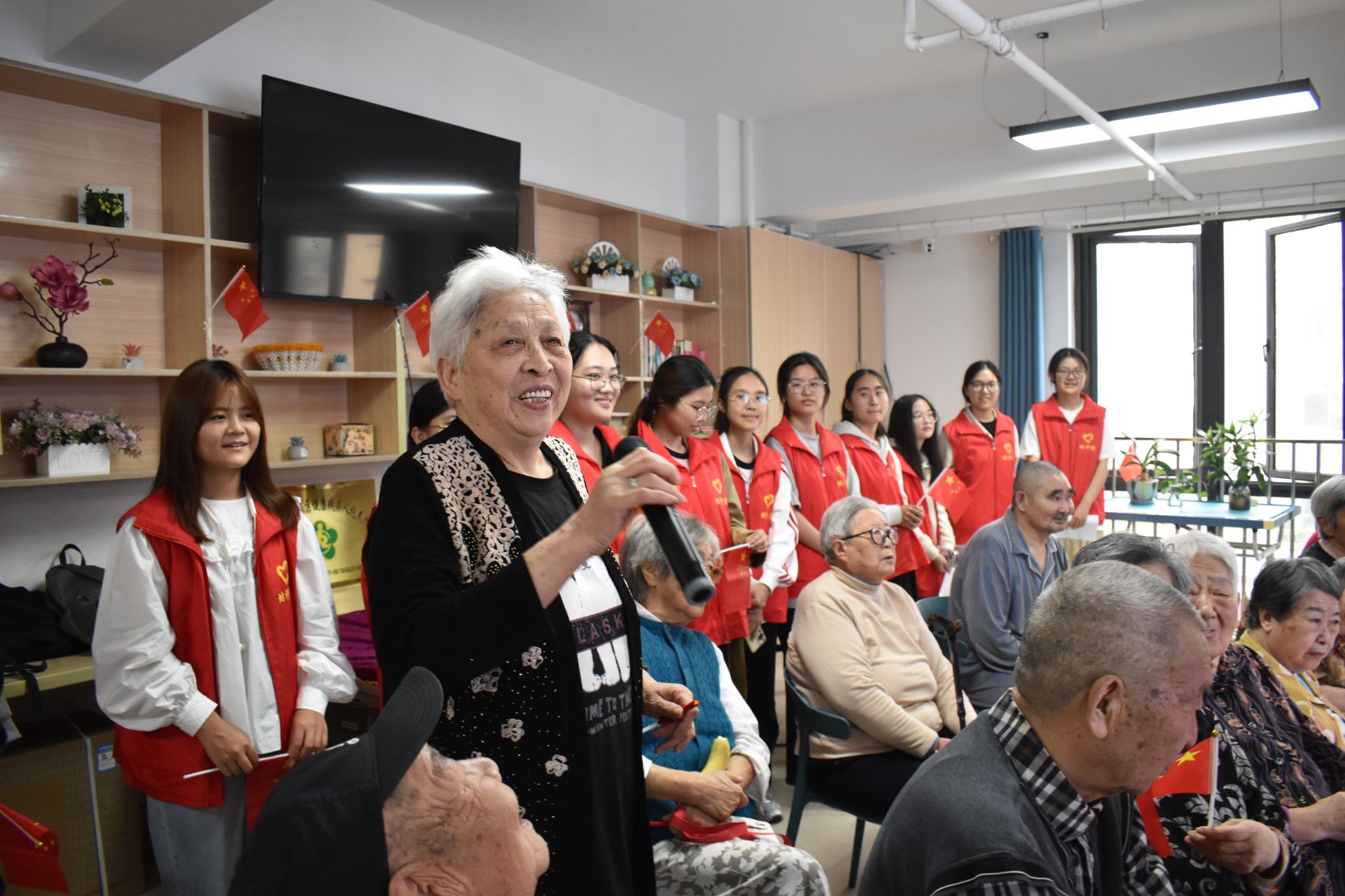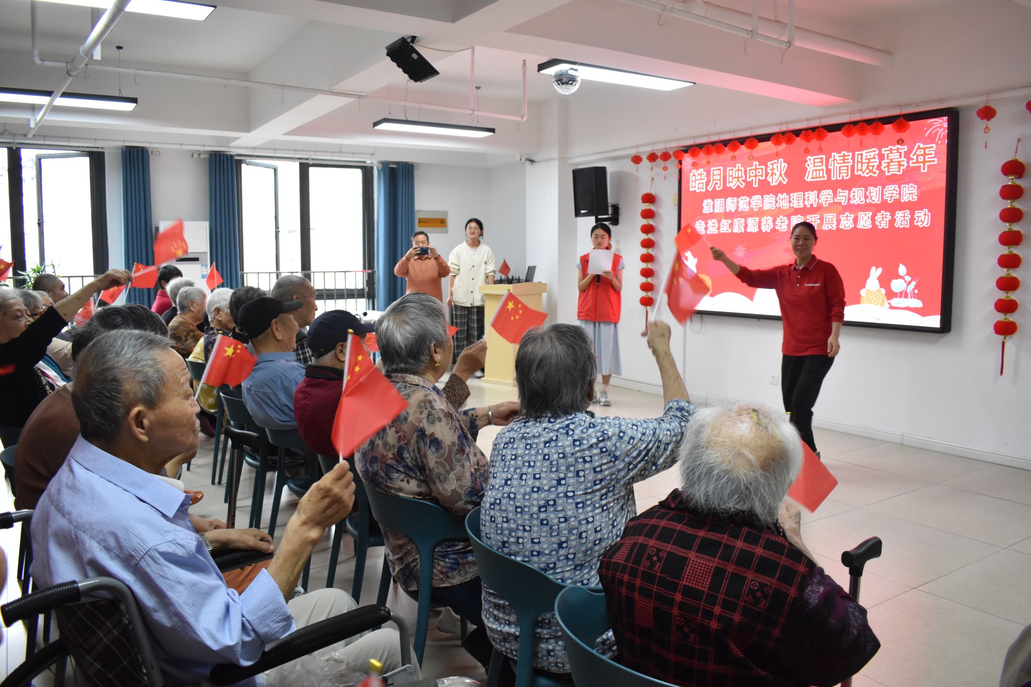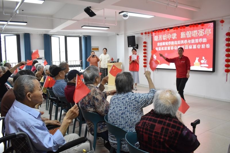 活动伊始,主持人向在场老人致以诚挚的中秋问候与祝福,志愿者们有序为每位老人送上小国旗。伴随着鲜红国旗的舞动,志愿者与老人们共同起身,齐声高唱《我和我的祖国》,嘹亮的歌声在活动现场回荡,营造出温馨且充满活力的氛围。