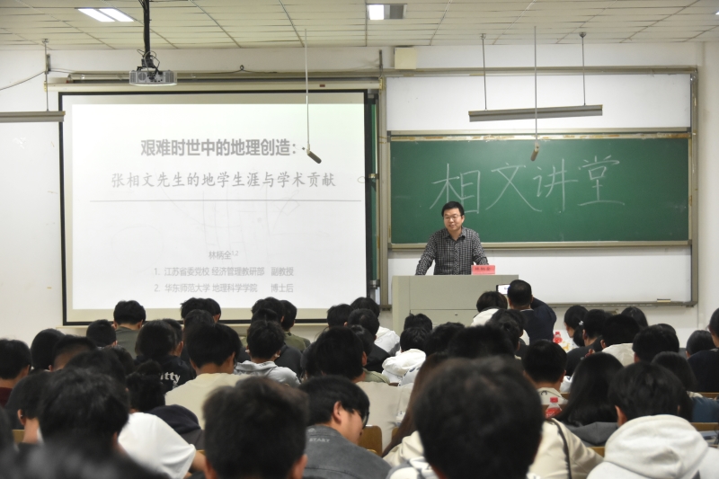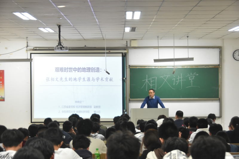 在讲座中,林柄全博士以“艰难时世中的地理之光:张相文先生的地学探索与学术成就”为题,进行了深入的讲解。他从研究背景谈起,全面介绍了张相文的生平事迹,特别是他与地理学的深厚渊源。林博士将张相文的一生划分为五个重要阶段,详细阐述了他在逆境中坚守报国理想、不断学习进取的感人故事。随后,他系统梳理了张相文的地理学贡献,深刻剖析了这些贡献的深远意义。最后,林博士总结了张相文学术思想的启示,鼓励同学们传承张相文的奋斗精神,学习他的团结协作能力和卓越的领导才能。